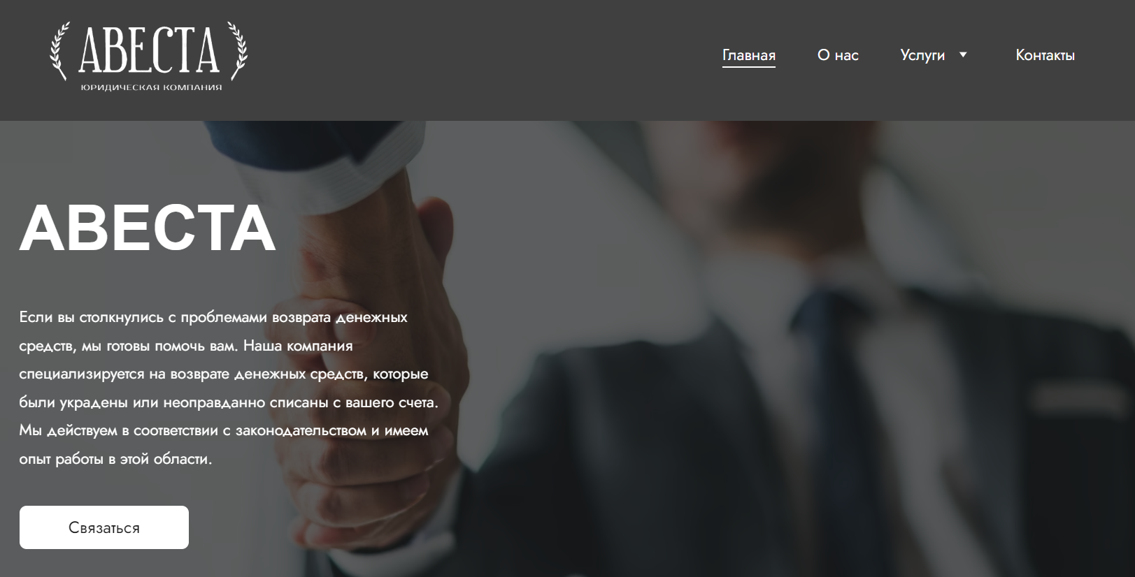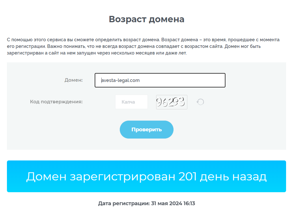 Один из важных признаков надёжности — возраст домена сайта. На своём сайте Lawyer АВЕСТА утверждает, что работает с 2010 года, но проверка показала, что домен avesta-legal.com создан недавно. Это может быть попыткой скрыть истинный возраст компании и избежать ответственности.