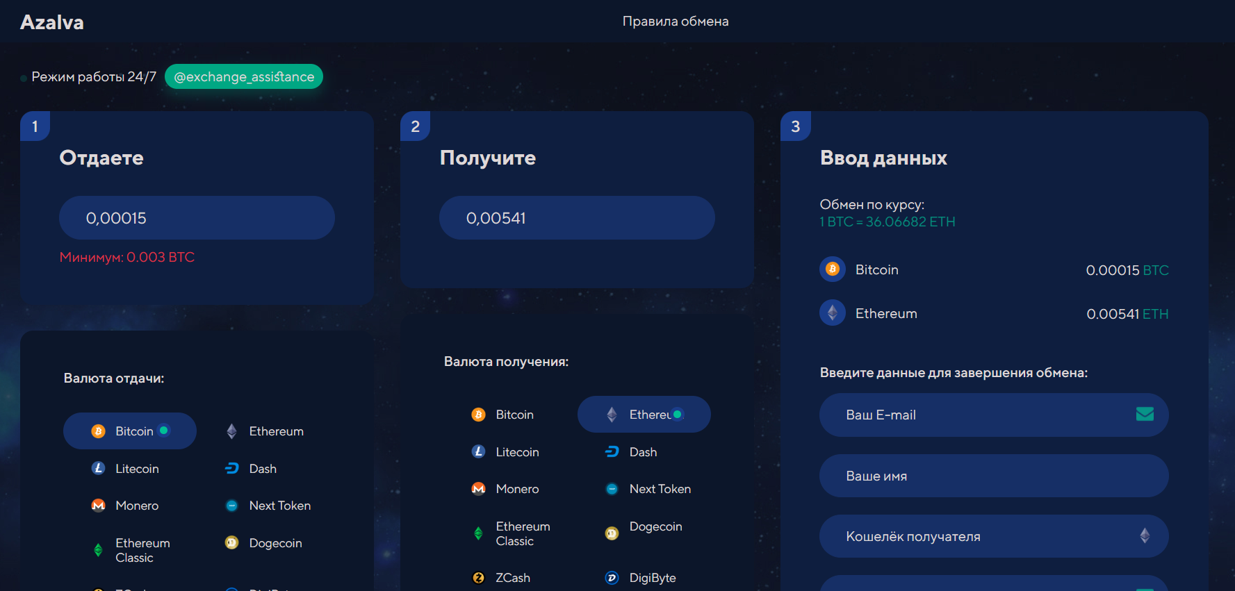 Azalva использует стандартные методы привлечения жертв, обещая выгодные условия обмена и высокую скорость транзакций. Мошенники активно продвигают платформу через Telegram, где создают видимость надежного сервиса. Вот что обещает этот сомнительный проект: