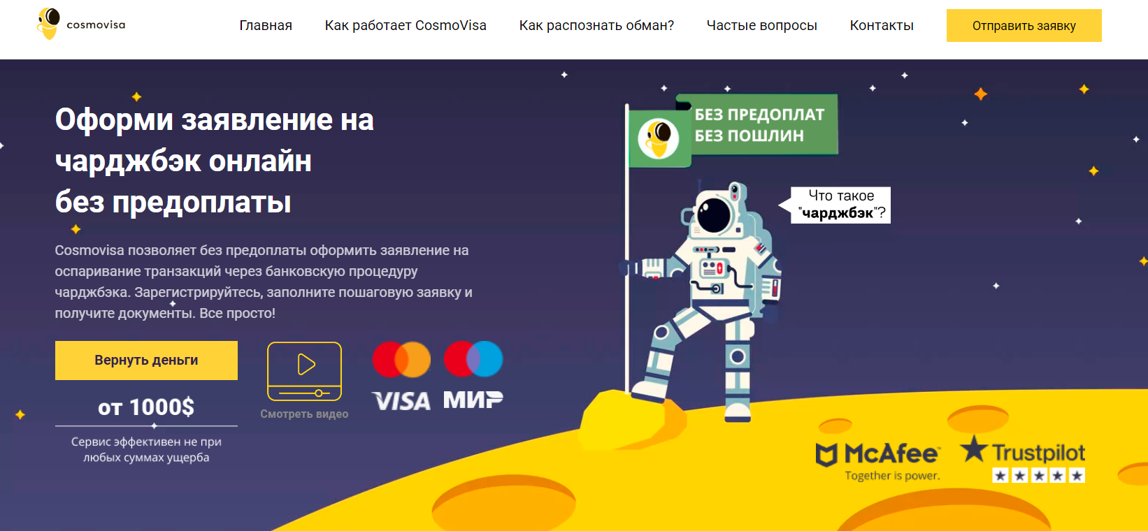 Мошенники обещают быстрое и успешное решение сложных вопросов, например, возврат средств или разрешение спорных ситуаций. Так, Cosmovisa утверждает, что специализируется на возврате средств через chargeback, однако за красивыми словами может скрываться пустое обещание. - Требование предоплаты
