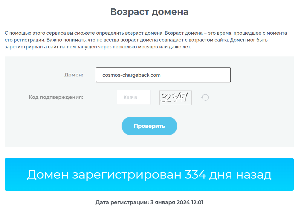 Домен cosmos-chargeback.com был зарегистрирован совсем недавно. Этот факт подтверждает, что компания, вероятно, создавалась для быстрого обмана клиентов и последующего исчезновения. Подобное поведение характерно для мошенников.