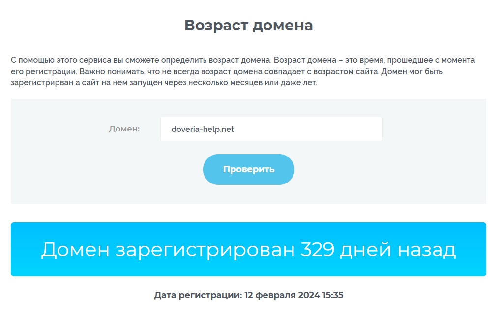Домен doveria-help.net был зарегистрирован недавно. Компании с короткой историей работы часто оказываются ненадёжными.