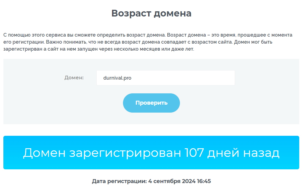 - Недавно созданный домен. Мошенники используют новый домен (durnival.pro), чтобы создать видимость надёжного проекта и скрыть свои настоящие намерения.