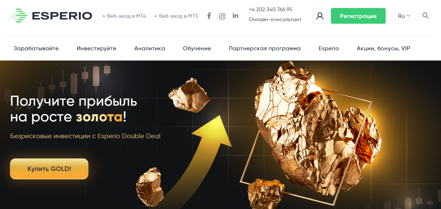 Esperio активно рекламирует свои услуги в интернете и социальных сетях, утверждая, что они предоставляют лучшие торговые условия. В своей рекламе этот брокер-мошенник делает следующие заявления: