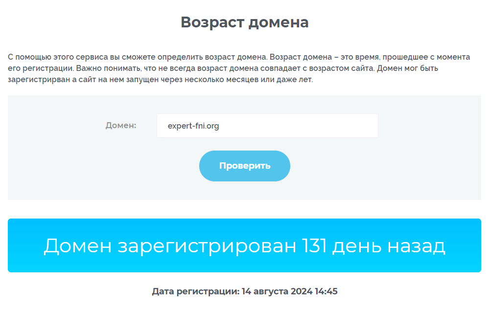 Домен сайта expert-fni.org был зарегистрирован недавно. Это частая тактика мошенников, которые создают новые ресурсы для сокрытия следов своей деятельности.