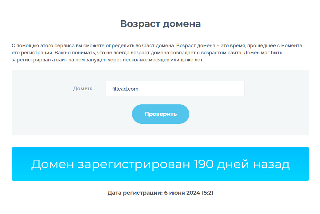 Сайт fillead.com создан относительно недавно. Этот факт может свидетельствовать о том, что компания намеренно скрывает свою деятельность. Некоторые мошенники покупают домены с историей, чтобы создать ложное впечатление надёжности.