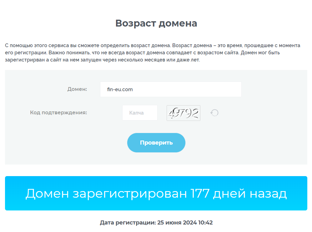 Возраст домена — важный показатель. Надёжные компании имеют сайты с длительной историей. Однако проверка показала, что домен fin-eu.com был создан недавно, что может свидетельствовать о недолговечности компании и попытке скрыть следы мошеннической деятельности.