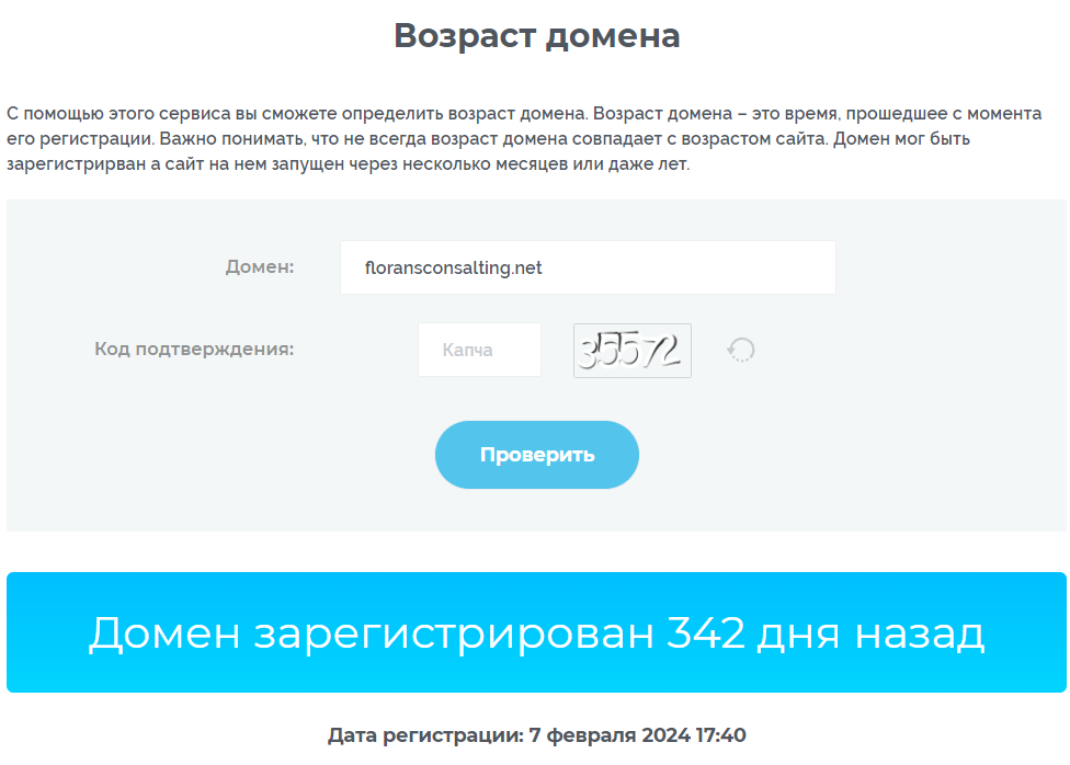 Домен floransconsalting.net был зарегистрирован совсем недавно. Новые домены часто используются мошенниками, чтобы замаскировать свои действия и быстро исчезнуть в случае претензий.