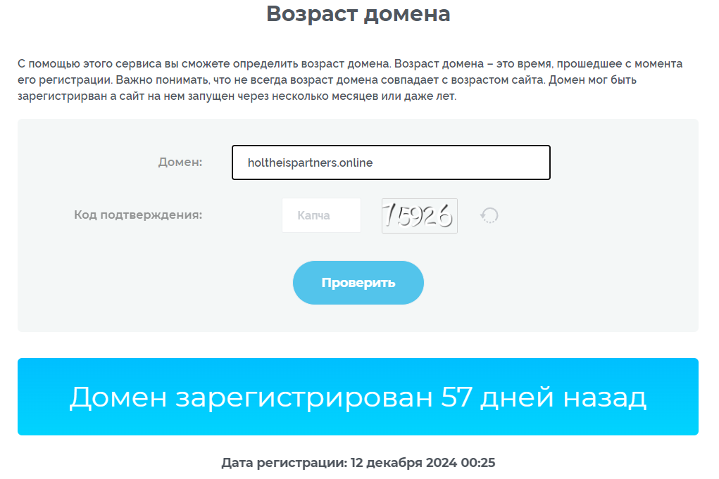 - Возраст домена holtheispartners.online был зарегистрирован недавно, что является тревожным сигналом. Мошенники часто используют новые домены, чтобы избежать ответственности и быстро сменить площадку.