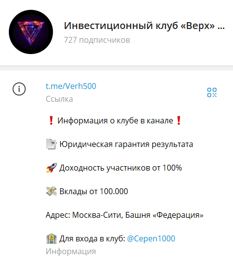 Одним из таких мошеннических проектов является Инвестиционный клуб “Верх” (t.me/Verh500). Этот канал преподносит себя как надежное сообщество для заработка, предлагая гарантированные инвестиционные сигналы, розыгрыши с крупными призами и быстрый доход без вложений. Однако за красивыми обещаниями скрывается классическая схема обмана, цель которой — выманивание денег у подписчиков.