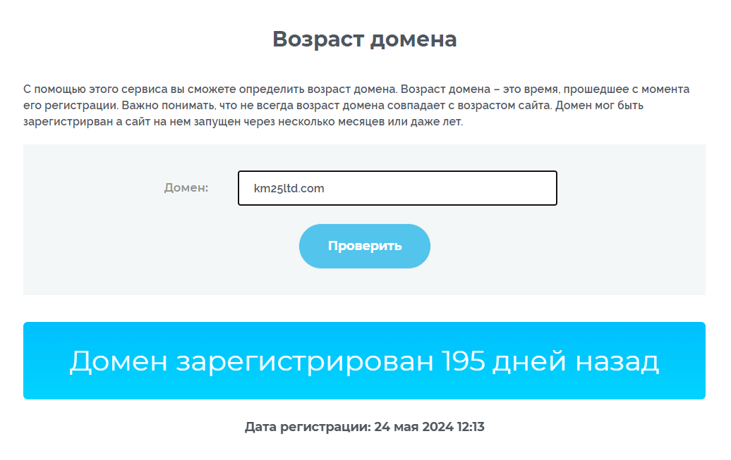 Домен km25ltd.com был создан недавно, что является тревожным сигналом. Мошенники часто регистрируют новые домены для быстрой смены названий и уклонения от ответственности.