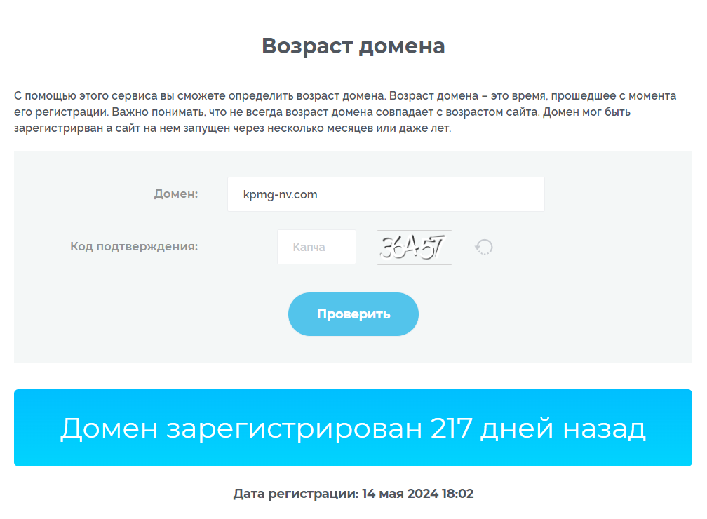 Домен kpmg-nv.com зарегистрирован совсем недавно, что вызывает серьёзные сомнения в добросовестности компании. Мошенники часто используют новые сайты, чтобы минимизировать вероятность разоблачения.