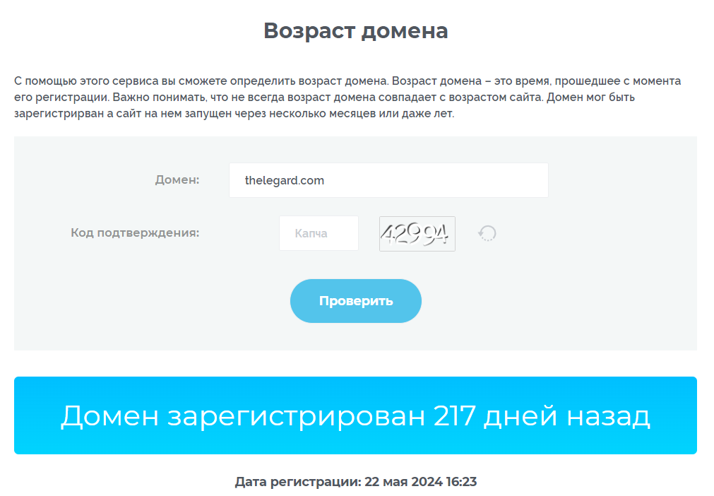Домен сайта thelegard.com был создан недавно. Это типичная тактика мошенников, которые регистрируют новые домены для краткосрочной работы, избегая ответственности.