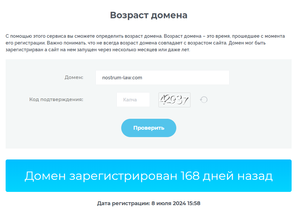 Сайт nostrum-law.com был создан недавно, что является одним из признаков сомнительных организаций. Мошенники часто используют новые домены, чтобы избегать ответственности и скрывать следы своей деятельности.