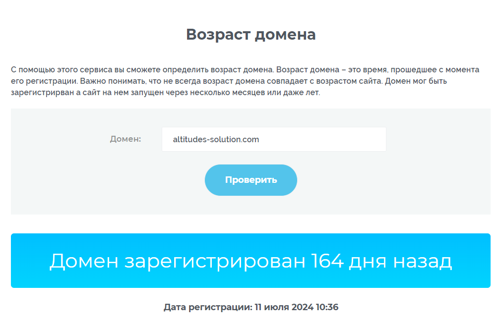 ООО «Альтитьюд» заявляет, что работает более 11 лет, но проверка домена altitudes-solution.com показала, что он был создан совсем недавно. Это несоответствие должно насторожить потенциальных клиентов.