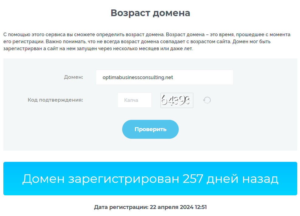 Несмотря на заявления о семилетнем опыте работы, домен optimabusinessconsulting.net был зарегистрирован совсем недавно, что вызывает подозрения. Многие мошенники создают новые домены, чтобы скрыть следы своей деятельности.