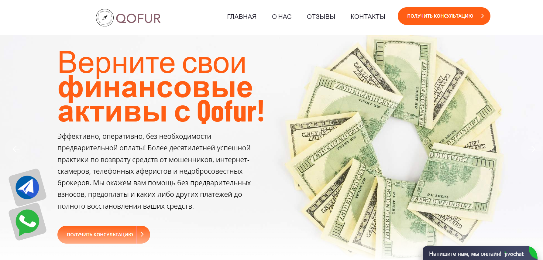 QOFUR предоставляет лишь два адреса, телефон и регистрационные данные, но на сайте отсутствуют лицензии или сведения о реальной юридической деятельности.