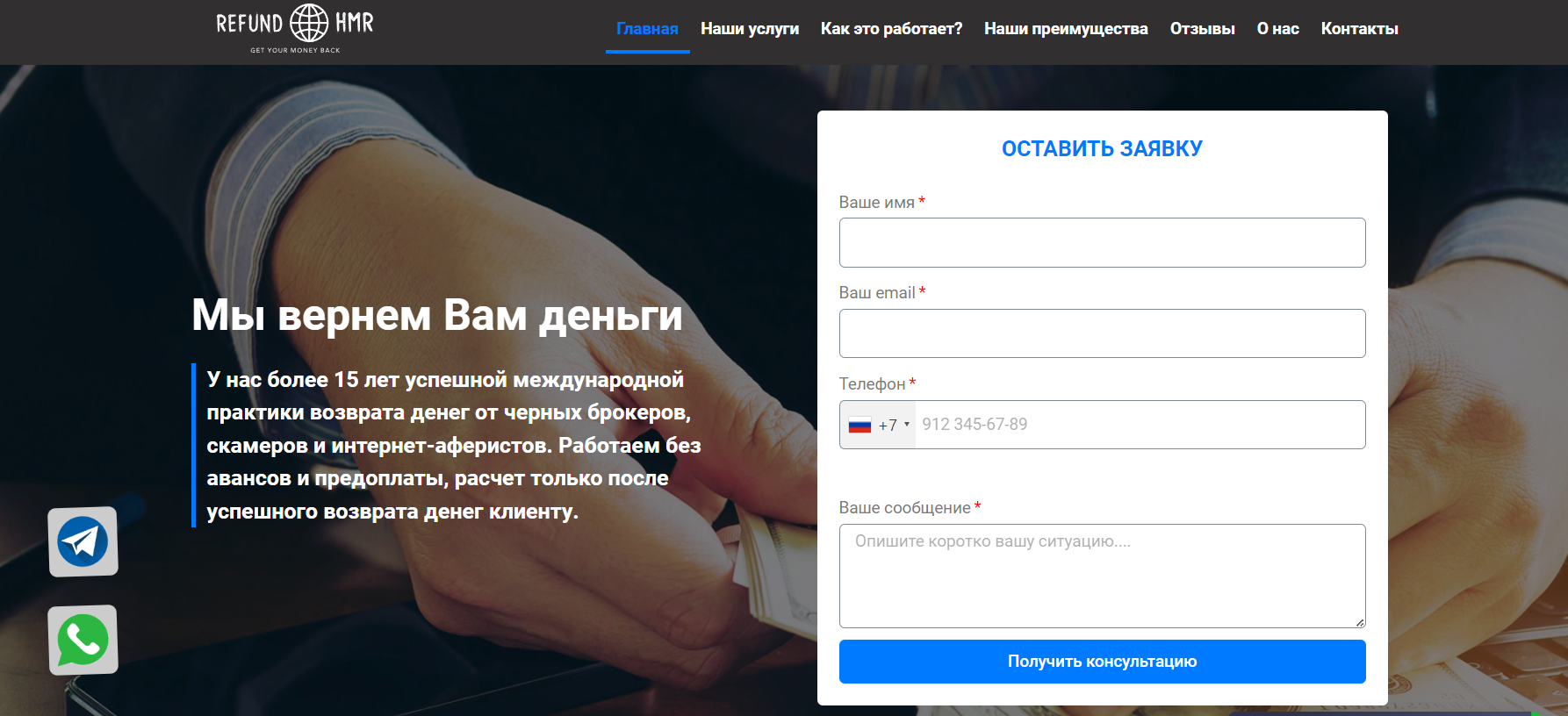 Refund HMR указывает телефон +7 (958) 538-53-55, но этого недостаточно для подтверждения их добросовестности. На сайте отсутствуют данные о сотрудниках, их квалификации или профессиональных ассоциациях.