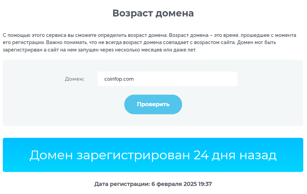 - Недавняя регистрация домена: проверка показала, что сайт Coinfop был создан совсем недавно, что является тревожным сигналом.