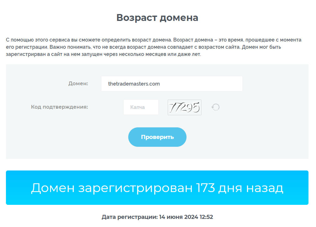 Домен thetrademasters.com был зарегистрирован совсем недавно, что указывает на временный характер проекта. Это типично для мошенников, которые закрывают сайты после того, как собирают деньги с клиентов. - Фальшивые данные