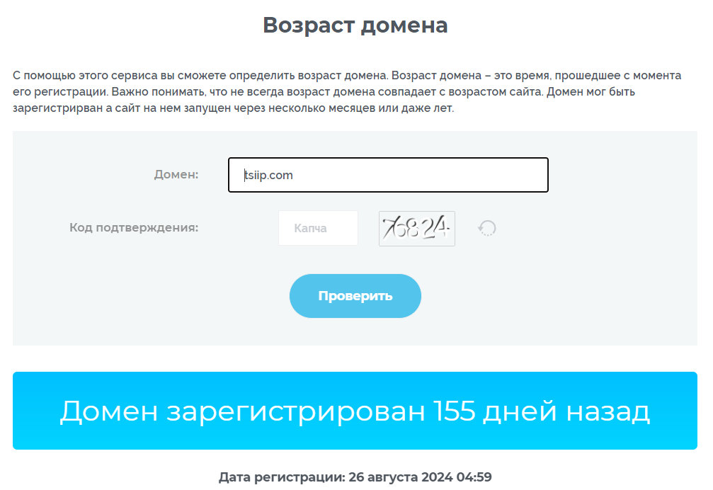 Сайт компании tsiip.com был создан недавно. Мошеннические организации часто используют свежие домены или домены с историей, чтобы создать видимость надёжности и скрыть свои следы.