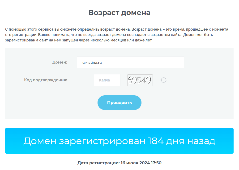 Проверка показывает, что домен ur-istina.ru был создан недавно, что является тревожным сигналом. Мошеннические компании часто используют новые домены, чтобы скрыть свою деятельность и в случае разоблачения легко закрыть сайт.