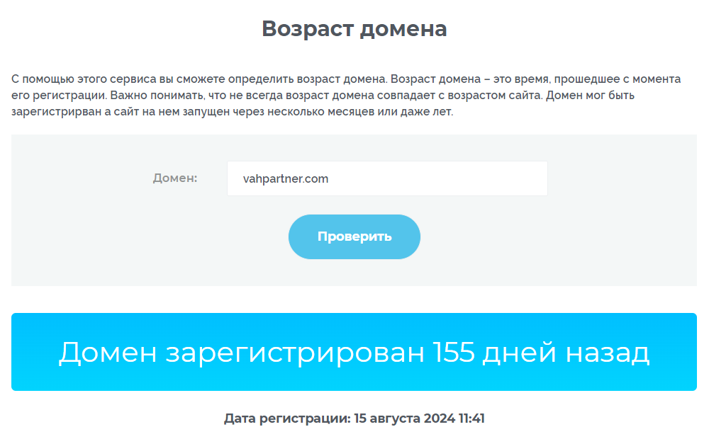 Проверка показала, что домен vahpartner.com был зарегистрирован недавно. Это может быть тревожным сигналом, так как мошеннические организации часто используют новые домены, чтобы скрыть свои следы в случае разоблачения.